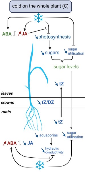Fig. 1. An example of the hormonal cross-talk under cold stress conditions in leaves, crowns, and roots of rice seedlings revealed by organ-targeted cold stress treatments (from Jarošová et al., 2024). Up-regulated levels are shown in red, down-regulated levels are shown in blue, and levels similar to the control are shown in green. Thin arrows indicate suppressed transport between leaves and roots. ABA – abscisic acid; DZ – dihydrozeatin; JA – jasmonic acid; tZ – trans-zeatin.